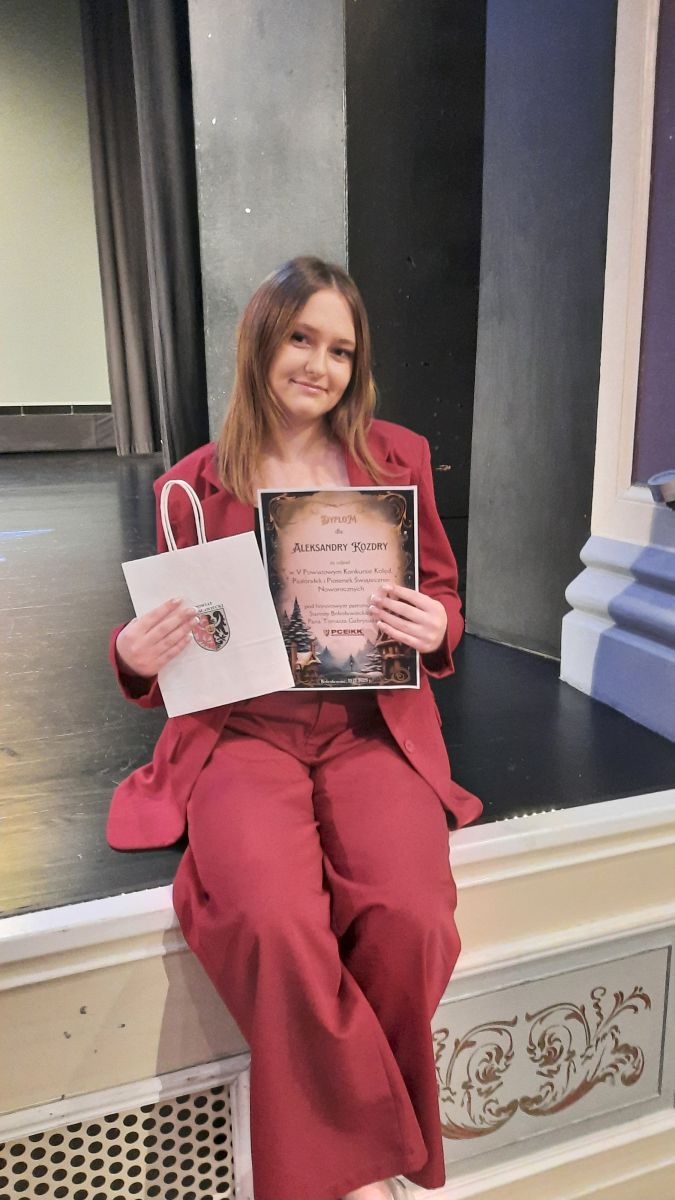 Aleksandra Kozdra, uczennica 4 klasy TL zajęła I miejsce w V Powiatowym Konkursie Kolęd, Pastorałek i Piosenek Świąteczno-Noworocznych w kategorii: szkoły ponadpodstawowe, klasy 3-5.